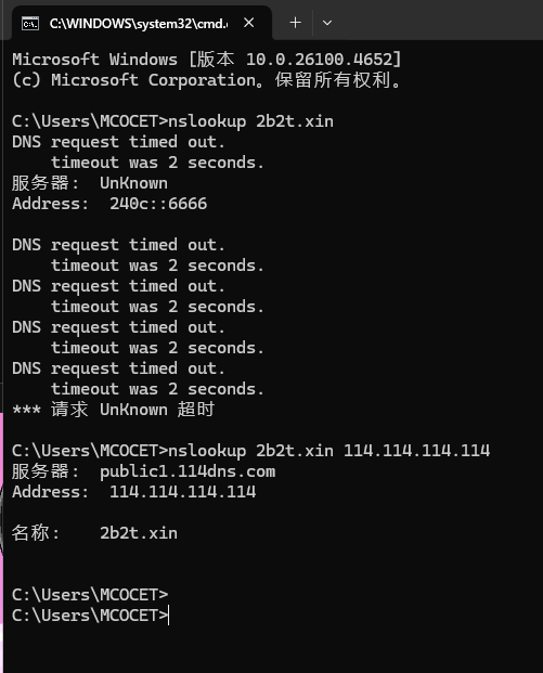 MCOCET 发表于 2025-12-13 10:11 刚刚图片链接打错了 我在家连不上服务器,也无法解析,提示:未知的主机名:2b2t.xin
